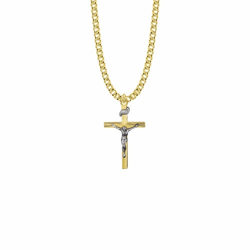 1-1/8 x 5/8 inch polished finish 14kt gold plated over sterling silver starburst crucifix necklace on a 20 inch stainless steel gold plated chain. The crucifix pendant features a gold cross with a silver raised figure of Jesus Christ on it. In the background there is starburst engraved detailing.