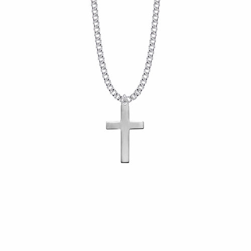 1 x 9/16 inch polished sterling silver plain cross necklace on 20 inch stainless steel rhodium plated chain. The cross pendant is unembellished and represents a classic and timeless style. Includes an elegant deluxe velour jewelry box.