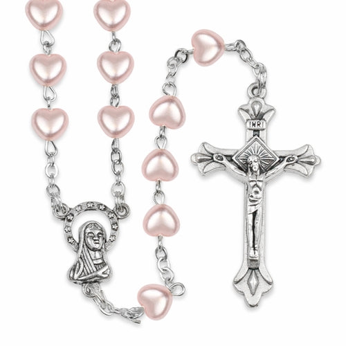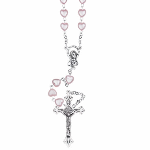 5mm heart-shaped pink plastic bead First Communion rosary with an antiqued silver plated crucifix and Madonna center. The centerpiece is shaped in a profile image of the Madonna, with a halo of stars around her head. It features raised details on her face and in the halo of stars. The crucifix also features ornate detailing and features a raised figure of Jesus Christ on it, measuring 1-3/8 inches. The full length of the rosary is 18 inches with a drop chain length of 3.5 inches. Includes an elegant deluxe velour rosary jewelry box with two loops.