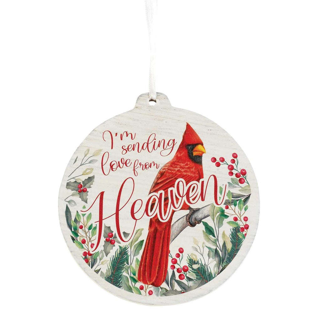 "I'm sending love from Heaven" ornament with cardinal is a beautiful way to remember a loved one at Christmas. Size is 4" wide x 4 1/4" high; made of wood. Design is on front; back is white. White hanging ribbon attached.