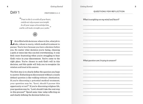 Each day includes a Scripture verse, a thoughtful reflection, questions for deeper prayer and meditation, and journaling space to capture insights and patterns as they emerge. The five-step discernment process is designed to help you recognize where God is speaking to your heart and how your unique gifts play a part in his greater plan.