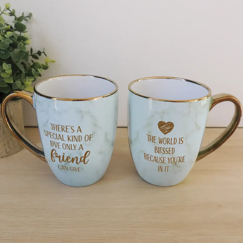 Mugs for special women in your life featuring Inspirational messages of faith. Pastel marbleized finishes accented with gold handle and rim. Not microwave safe. Hand wash only. Do not microwave. 4 ½” H x 3 ½” D. 18 oz.