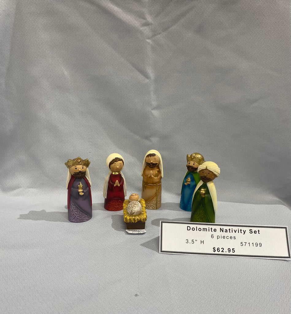 This small 6pc resin Nativity features the Holy family Mary, Joseph and Baby Jesus in manger and the 3 wisemen and a tent.