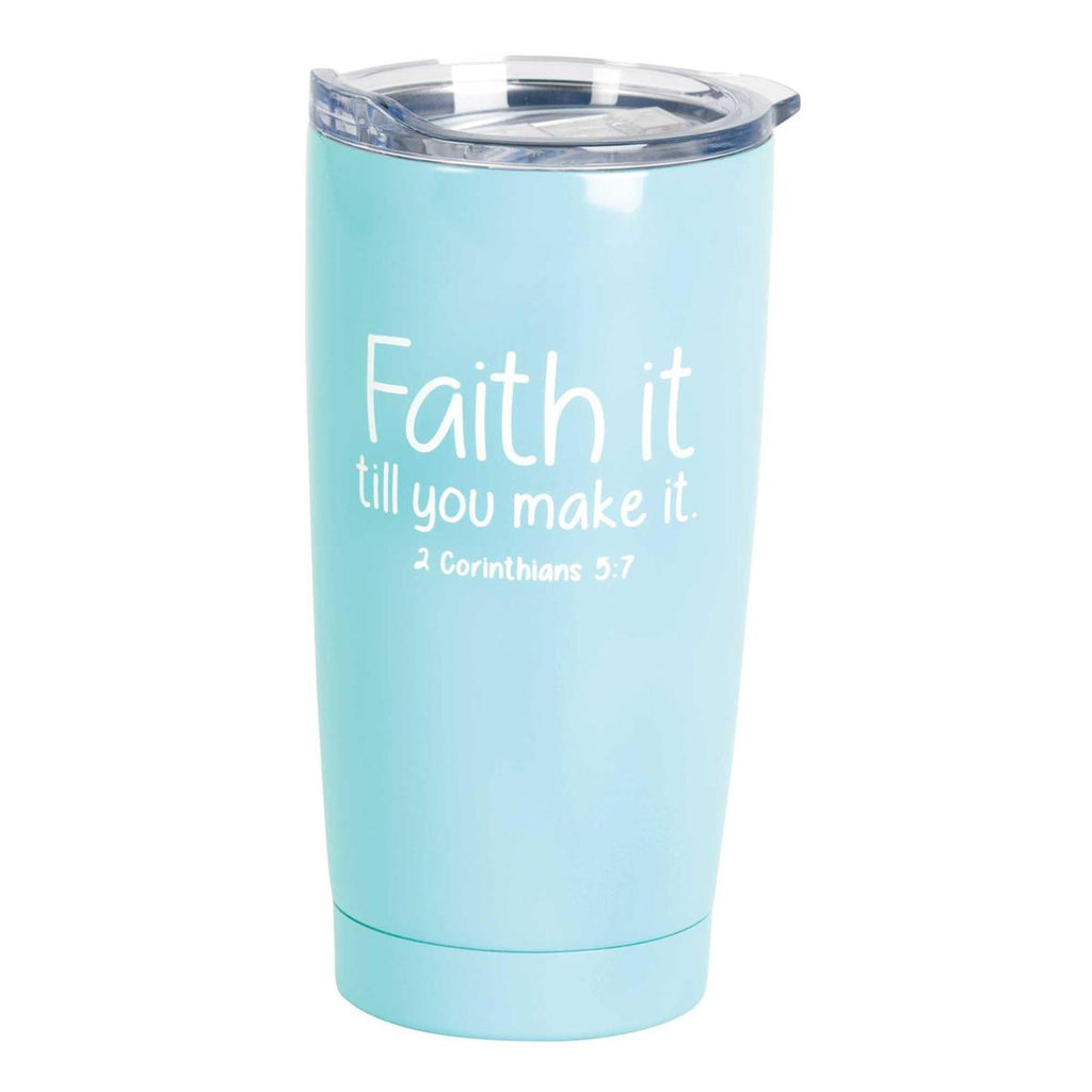 Inspiring Travel Tumbler Is Decorated On One Side With A Paraphrase Of 2 Corinthians 5:7. Tumbler Is 18/8 Stainless Steel Inside And Out; Finished In Teal On The Outside. Holds Up To 20 Ounces; Keeps Hot Drinks Hot And Cold Ones Cold For Hours. Clear Lid Includes Silicone Sealing Ring And A Sliding Mechanism To Easily Cover Or Uncover The Drink Opening. To Care For Tumbler, Hand Wash Only And Do Not Use In Microwave. Scripture Paraphrase: Faith It Till You Make It.