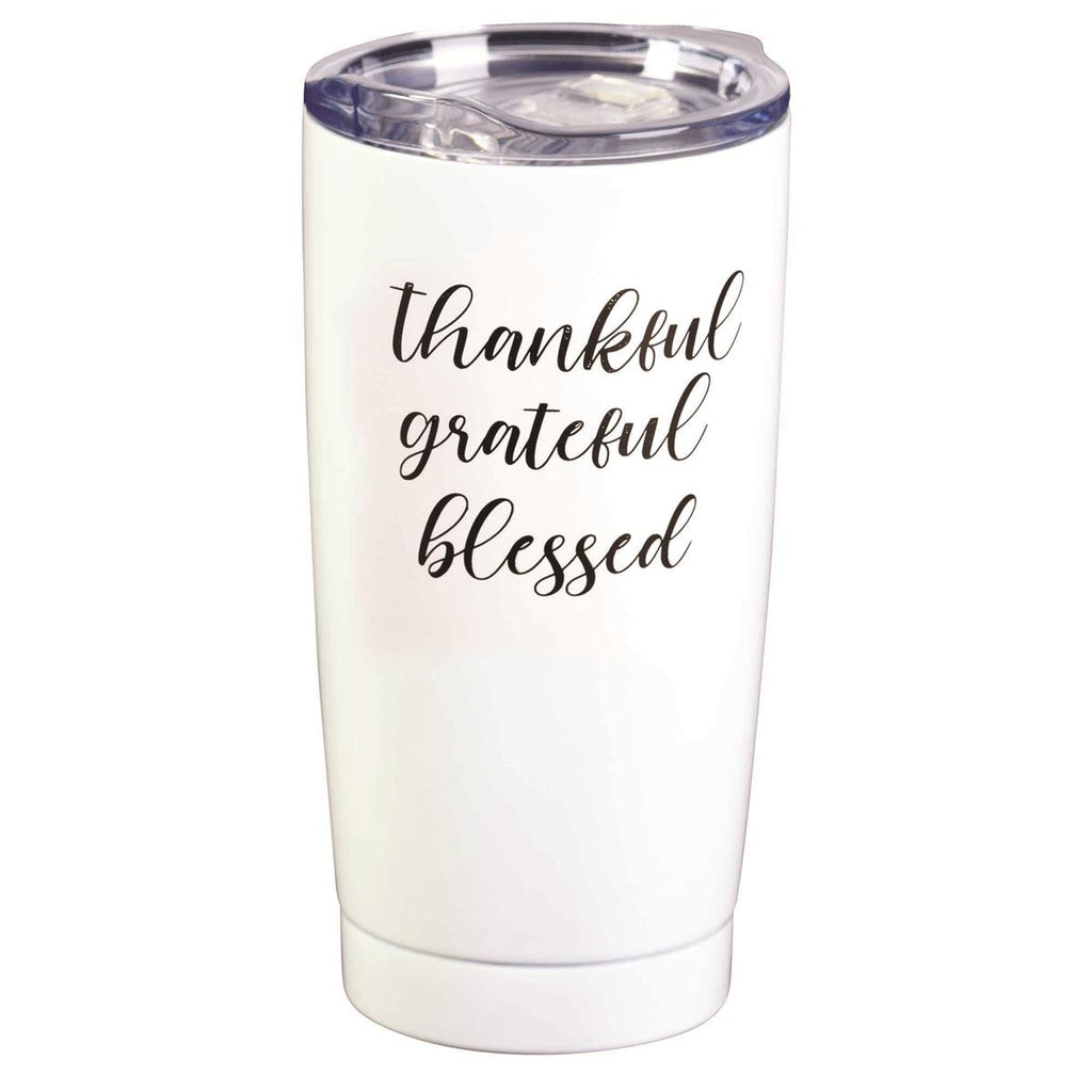 Inspiring travel tumbler is decorated on one side with "thankful grateful blessed." Tumbler is 18/8 stainless steel inside and out; finished in white on the outside. Holds up to 20 ounces; keeps hot drinks hot and cold ones cold for hours. Clear lid includes silicone sealing ring and a sliding mechanism to easily cover or uncover the drink opening. To care for tumbler, hand wash only and do not use in microwave.